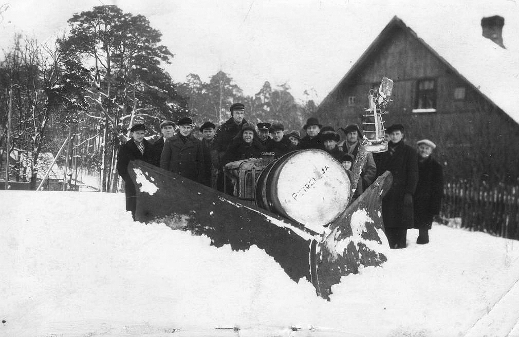 1. Bauskas ceļu pārvaldes darbinieki 11. ceļu inženieru postenī pie sniega arkla jeb šķūres, kas uzmontēta traktoram “Caterpillar”. 1930. gadu beigas. Foto no Latvijas ceļu muzeja.