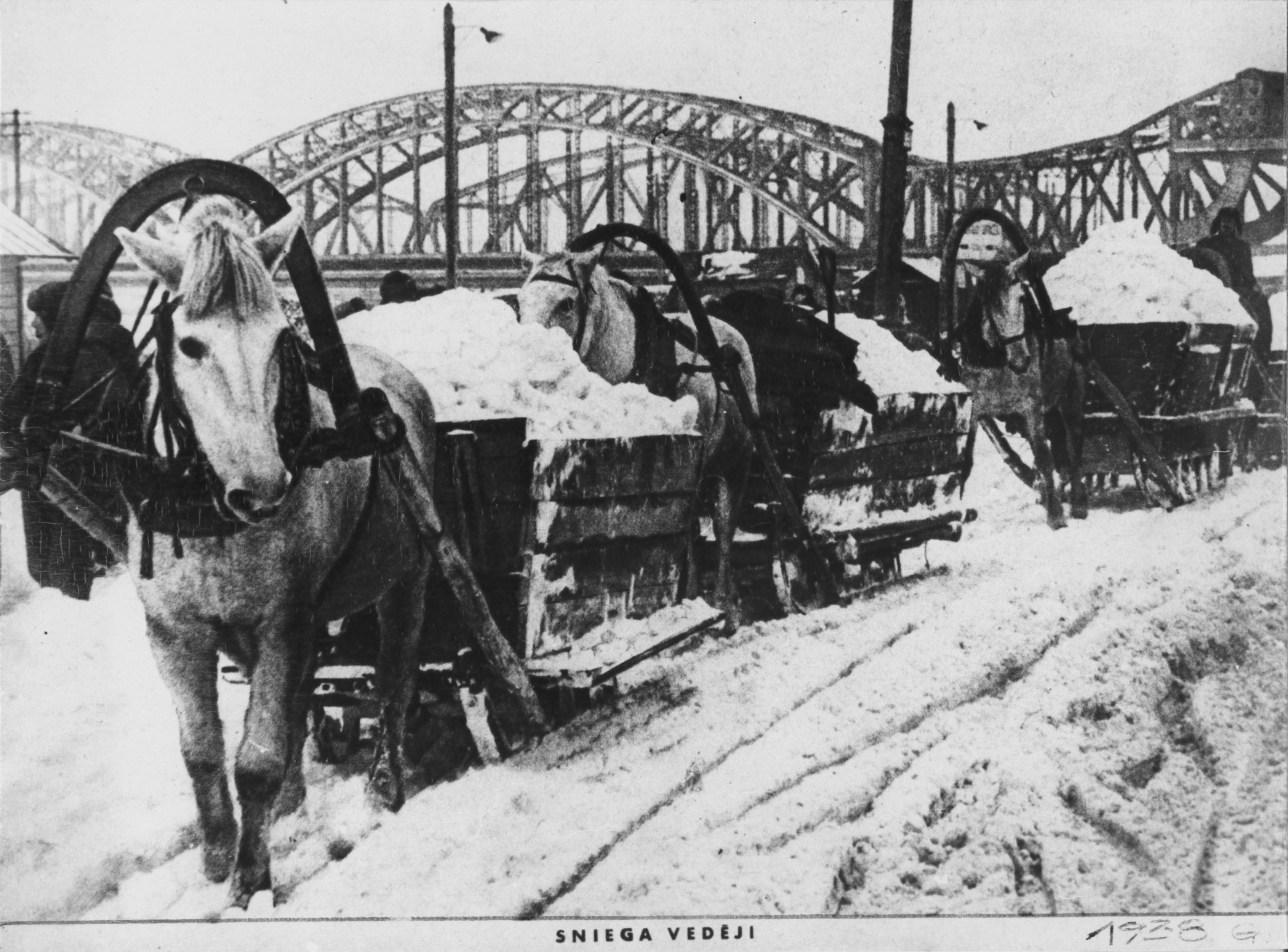 3. Sniega vedēji Rīgā, 1936. g. Sniegu ar pajūgiem veda ārā no Rīgas un bēra Daugavā. Foto no Latvijas ceļu muzeja.