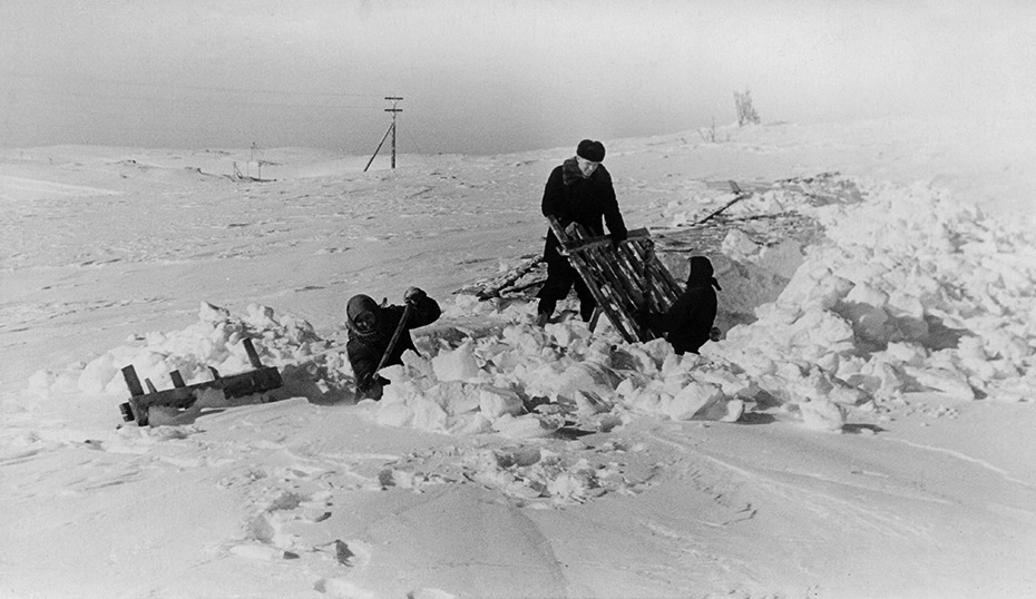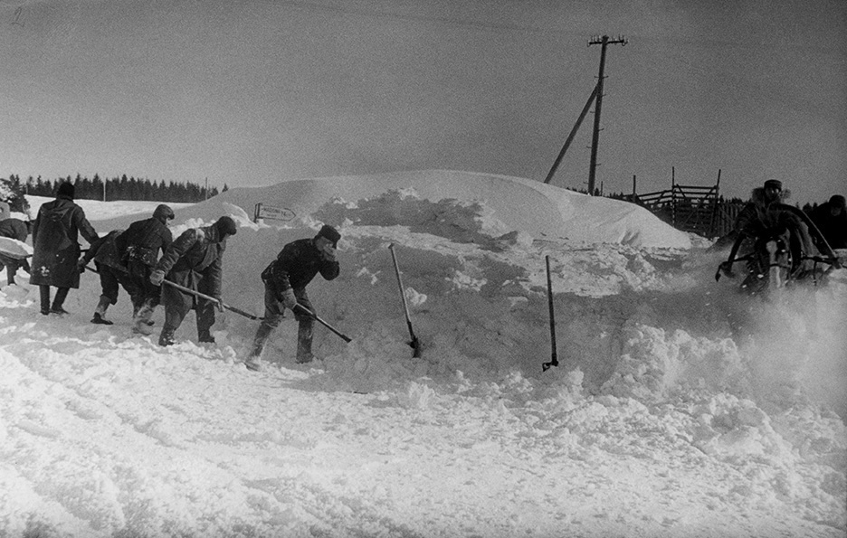 4. Strādnieki ar lāpstām tīra sniegu pie autoceļa Rīga–Pleskava, 1946. gada ziema. Foto no Latvijas Ceļu muzeja.