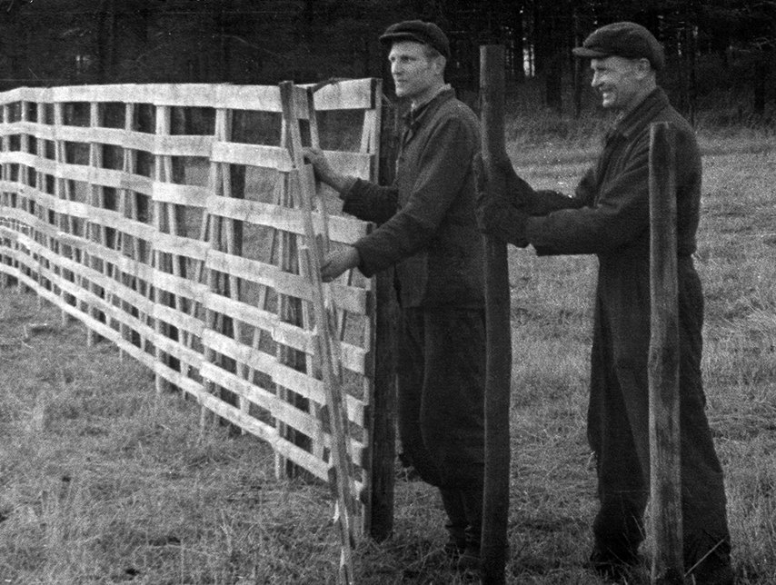 7. Sniega vairogu uzlikšana pirms ziemas sezonas, 20. gs. 60. gadi. Foto no Latvijas Ceļu muzeja.