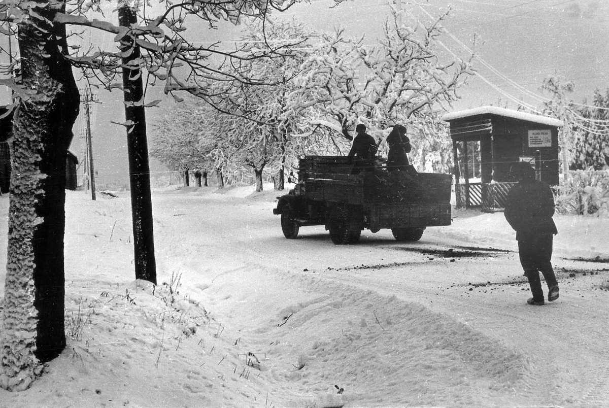 9. Ceļa kaisīšana ziemā, 1960. gadi. Foto no Latvijas Ceļu muzeja.