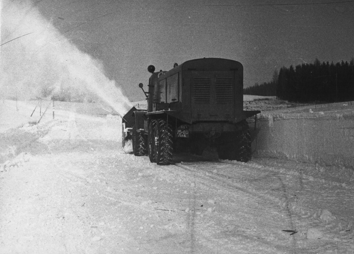 8. Ziemas dienesta sniega pūtējs darbībā, 1960. gadi. Foto no Latvijas Ceļu muzeja.