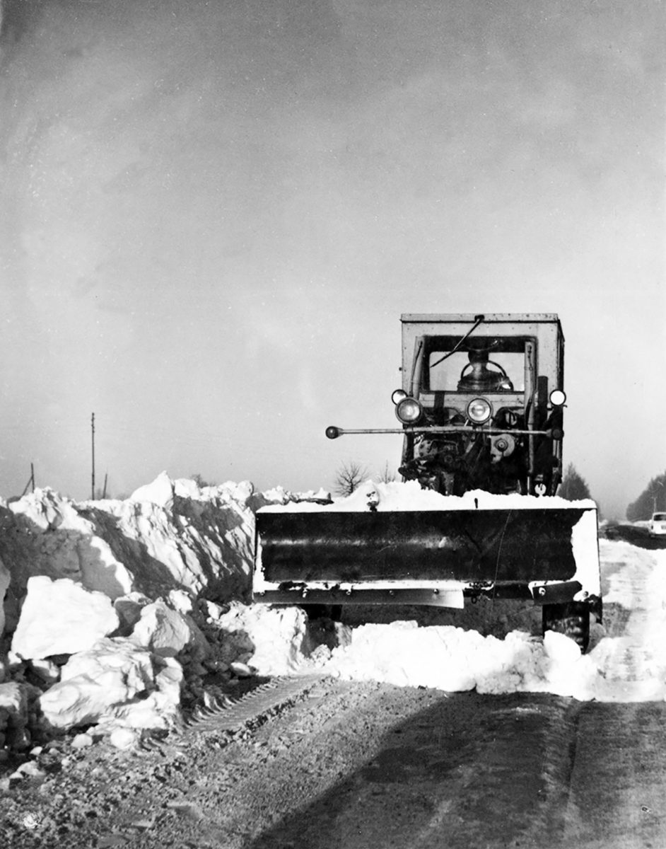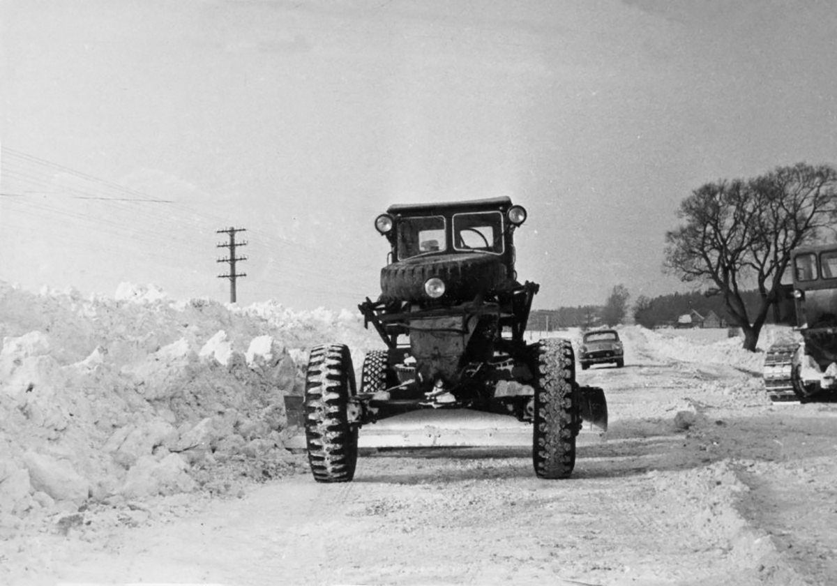 12. Ceļa segas attīrīšana no sniega ar traktoru T-16, kas aprīkots ar sniega pūtēju. 1970. gadi. Foto no Latvijas Ceļu muzeja.