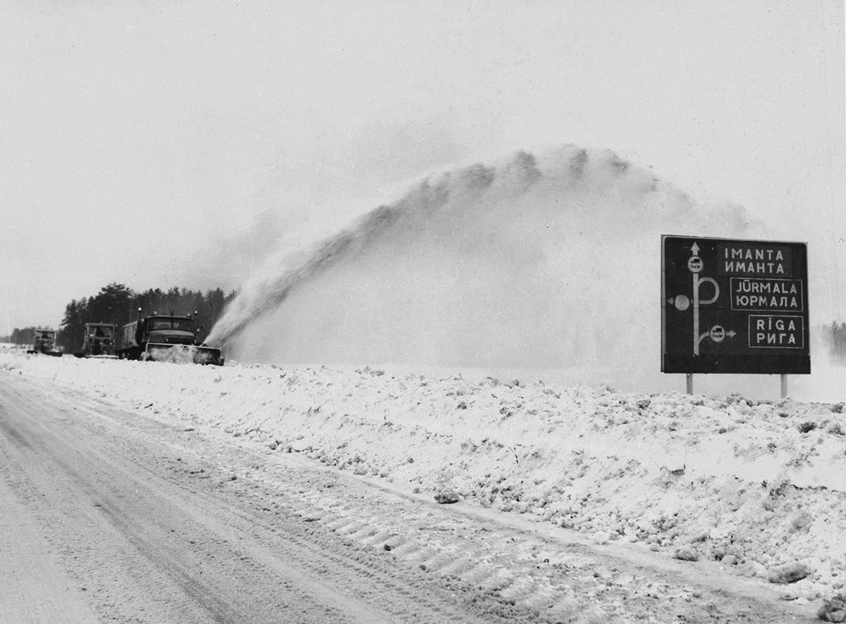 13. Sniega pūtējs, 1970. gadi. Priekšplānā virzienu norādošā ceļazīme “Imanta, Jūrmala, Rīga”. Foto no Latvijas Ceļu muzeja.