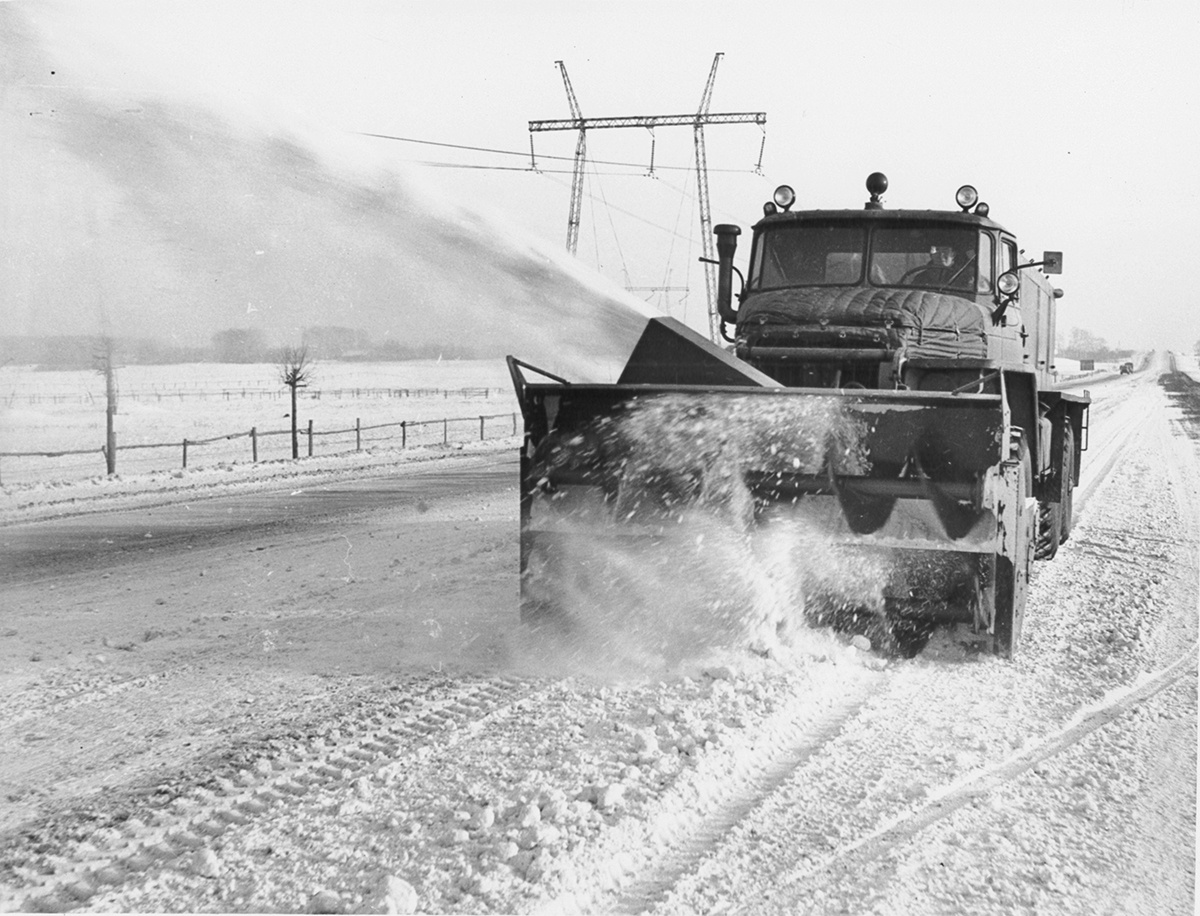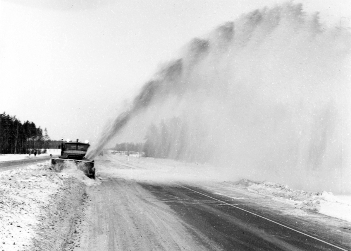 14. Sniega novākšana Pierīgas maģistrālēs ar sniega pūtēju, 1970. gadi. Smagā automašīna ar lāpstu un rotoru sniega valni aizpūš tālu pāri vairāku joslu ceļam. Foto no Latvijas Ceļu muzeja.