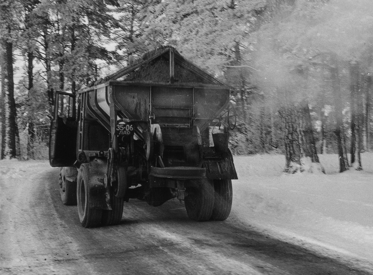 15. Tehnika pielāgota ceļu kaisīšanai ziemā – minerālmēslu izkliedētājs KSA-3 uzmontēts uz automašīnas ZIL-130 PM. 1970. gadi. Foto no Latvijas Ceļu muzeja.