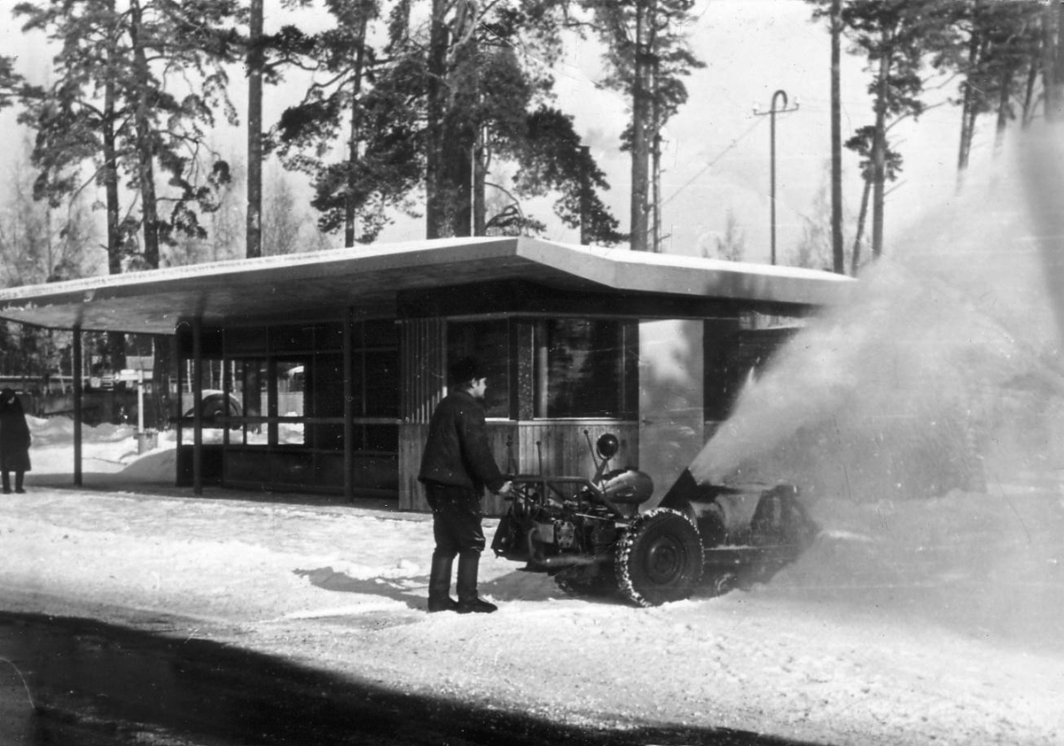 16. Pieturvietas tīrīšana ar rokas mehanizēto sniega tīrītāju. 1970. gadi. Foto no Latvijas Ceļu muzeja.