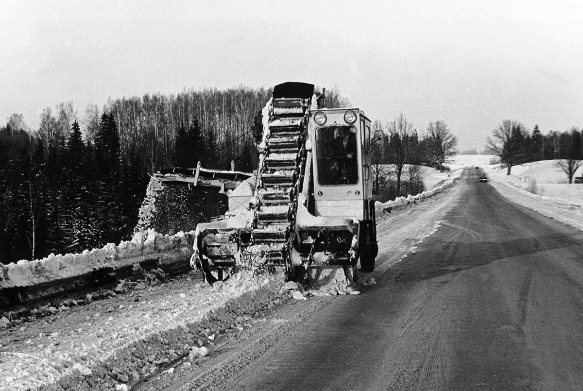 18. Sniega savācējs ar transportieri attīra ceļu pie Cēsīm, 1970. gadi. Foto no Latvijas Ceļu muzeja.
