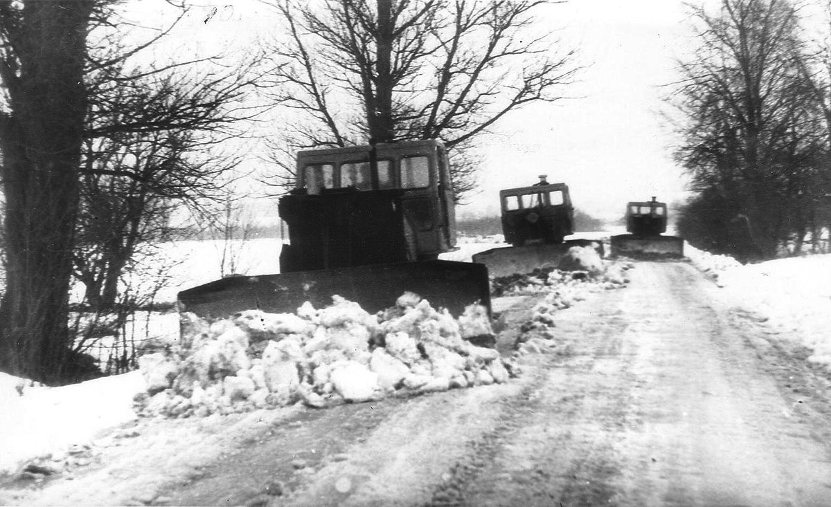 20. Nomātās tehnikas brigāde Liepājas rajonā ar buldozeriem tīra ceļu tīra ceļu visā platumā. 1980. gada 9. decembris. Foto no Latvijas Ceļu muzeja.