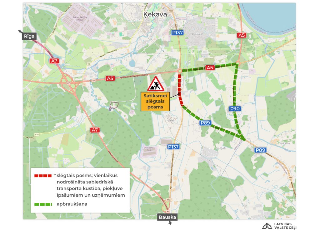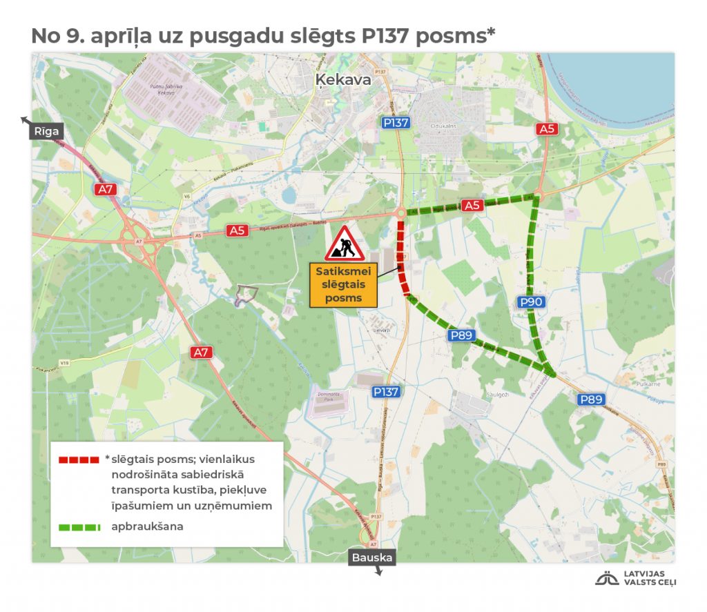 Būvdarbu dēļ līdz oktobrim tiks slēgts reģionālā autoceļa Lapenieki–Ķekava–Ģūģi (P137) jeb agrākās Bauskas šosejas (A7) posms no Rīgas apvedceļa (A5) līdz krustojumam ar reģionālo ceļu Ķekava–Skaistkalne (P89) (9,552–10,303 km).
