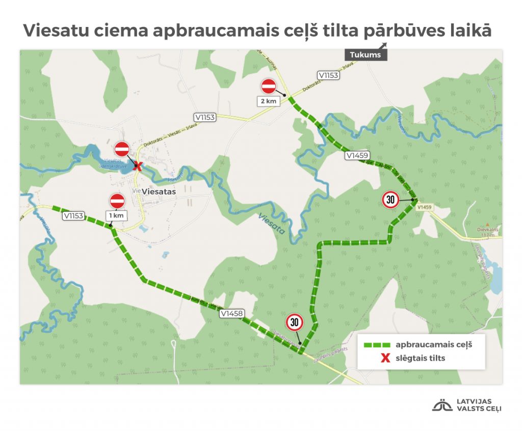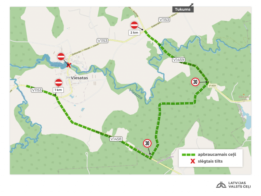 No 27. aprīļa tiltu slēgs, apbraukšana būs pa vietējo autoceļu Jaunpils–Viesāti (V1458), AS Latvijas valsts meži piederošo Āres lauku ceļu un vietējo autoceļu Aizupe–Alkšņi–Strutele–Auziņas (V1459), maršruta kopgarums ap 8 km, no kuriem ap 500 metriem ir ar asfalta segumu. Gājēju un velosipēdistu satiksmi pāri Viesatas upei darbu laikā organizēs pa pagaidu gājēju tiltu.