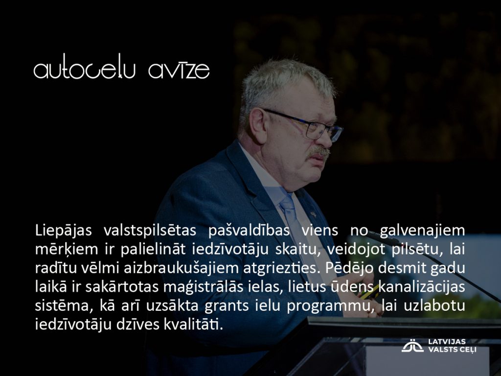 Liepājā bija lielas problēmas ar applūstošām ielām un pat teritorijām. Piemēram, Vecliepājā, kurā ietilpst arī Liepājas vēsturiskais centrs, faktiski nebija izbūvēta lietus ūdens kanalizācijas sistēma. Tā bija kopējā sistēmā ar sadzīves kanalizāciju. Tagad tā ir izbūvēta daudzās vietās un būtiski samazinājušas problēmu ar applūšanu. Mēs ejam uz to, ka pilsētā lietus ūdens kanalizācijas sistēmai ir jābūt nodalītai no sadzīves kanalizācijas sistēma, tas samazina arī attīrīšanas iekārtu noslodzi. Ja 2007. gadā lietus ūdens kanalizācija bija aptuveni 50 km, tad šobrīd tā ir aptuveni divas reizes garāka. Ir rajoni, kur izveidotas arī grāvju sistēmas. Vēl realizējam iekškvartālu programmu, kuras ietvaros sakārtojam pašvaldībai piederošās ielas dzīvojamo māju rajonos. Es teiktu, ka šī programma faktiski jau ir noslēgusies. Savukārt otra programma ir saistīta ar dzīvojamo māju iekšpagalmu sakārtošanu, kas ietver arī bērnu laukumu, apstādījumu, soliņu ierīkošanu. Programmu uzsāka 2013.gadā un vidēji katru gadu no pašvaldības budžeta tiek piešķirti aptuveni 600 tūkstoši eiro. Liepājā ir ļoti aktīva neredzīgo biedrība. Vēl pirms 2000. gada luksoforus pilsētā jau sākām aprīkot ar skaņu. Tagad tā ir kļuvusi par normu un nav jautājumu, ka varētu būt savādāk. Es domāju, ka Latvijā mēs bijām pirmie, kas Apbūves noteikumos jau 2012. gadā iekļāva stingras prasības vadlīniju izbūvei ietvēs. Arī pludmalē ir komplekss, kur ir iespēja cilvēkiem ar kustību traucējumiem var ar ratiņkrēslu iebraukt jūrā, bet arī neredzīgs cilvēks var iet peldēties. Ir audioboju sistēma un neredzīgs cilvēks bet saprot, kur ir krasts un kur ir jūra. Šī iespēja tika izveidota 2014 gadā, un tad kaut kas līdzīgs bija tikai Somijā un Francijā. Tāpat ir pielāgota arī tualete, pārģērbšanās vieta, bet pludmales laipām ir atbilstošs krāsojums. Man ir liels prieks un gandarījums, ka varam realizēt šādus projektus.