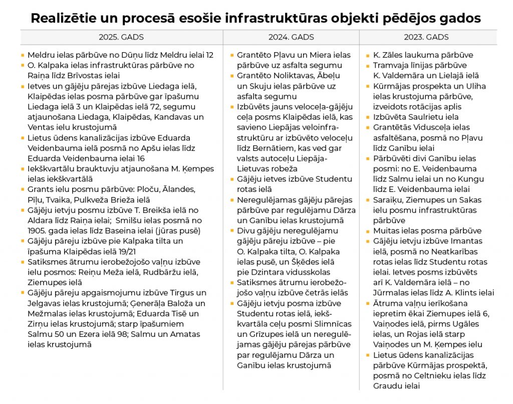 Pirmā ielu sakārtošanas un segumu atjaunošanas programma Liepājā uzsākās 2006. gadā, vēl pirms ES fondu projektiem. Tās ietvaros tika sakārtots esošo ielu segums un arī asfaltētas ielas ar grants segumu. Tajā laikā pašvaldībai bija jāizvēlas, pa kuru ceļu iet: nomainīt ielām tikai segumu, neķeroties klāt apakšā esošajām komunikācijām, vai arī veikt pamatīgāku pārbūvi. Pirmajā variantā efekts ir ātrs un var salīdzinoši daudz izdarīt, bet mīnus ir tāds, ka diezgan ātri sākas problēmas. Piemēram, ja plīst ūdensvads vai kanalizācija, iedzīvotājiem ir grūti paskaidrot, kāpēc uzrokam nesen asfaltētu ielu. Pašvaldība beigu beigās izvēlējās variantu, ja taisa ielu, tad ir jāsakārto arī apakšzeme un komunikācijas. Ieguvumu no šī lēmuma redzat vēl šobrīd. Maģistrālās ielas, kas ir pārbūvētas pirms 14 gadiem, ir tehniski labā stāvoklī, pat neskatoties uz lielo transporta plūsmu. Maģistrālās ielas mēs visas esam pabeiguši. Pirmā iela 2010. gadā bija Pulvera iela, 2011. gadā Brīvības iela, tad sekoja Parka un Zirņu ielas (2012) un pēdējais Brīvības ielas posms un Zvejnieku iela 2014. gadā. Pats pēdējais bija valsts reģionāla autoceļa Liepāja–Tāši (P110) Grīzupes ielas posms 2018. gadā. Mēs ļoti ceram, ka nākamgad izdosies iegūt finansējumu, kas ir domāts maģistrālo ielu virskārtas atjaunošanai. Brīvības ielai ir 14 gadi un sākam jau to labot. Negribās ielaist, lai nav atkal jālabo kaut kas fundamentāls. Pulvera iela gan ir vēl tehniski labā stāvoklī.