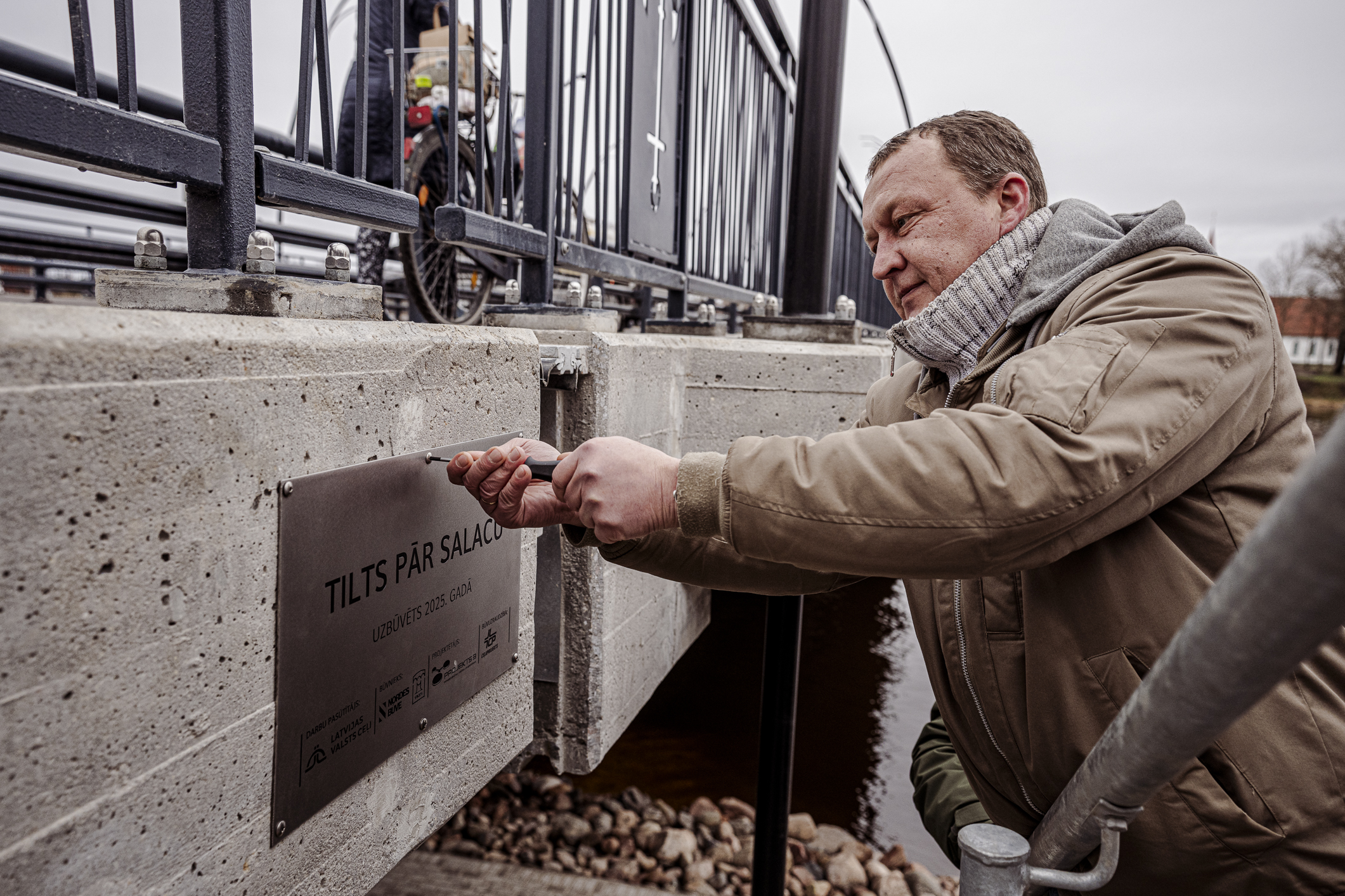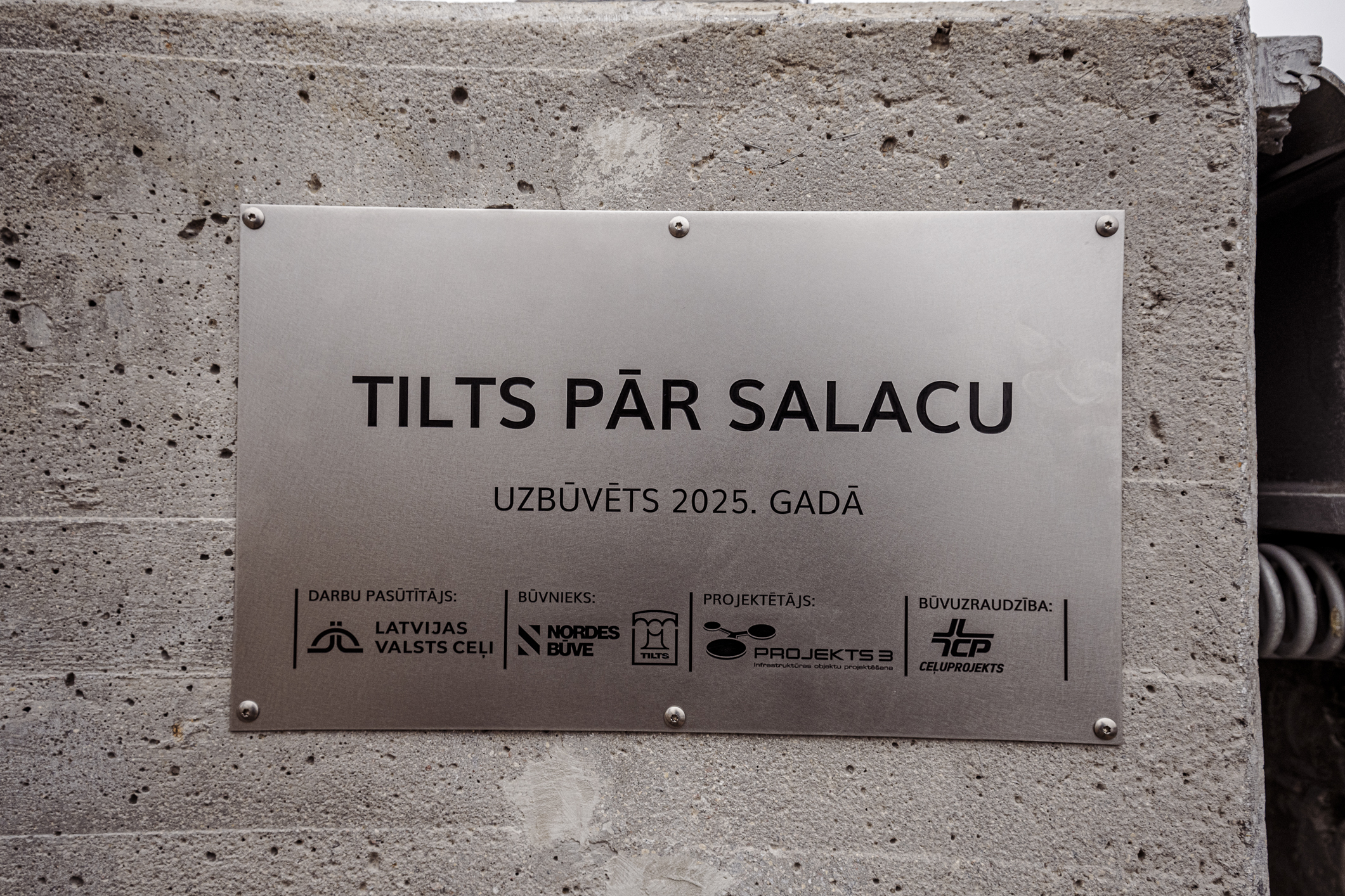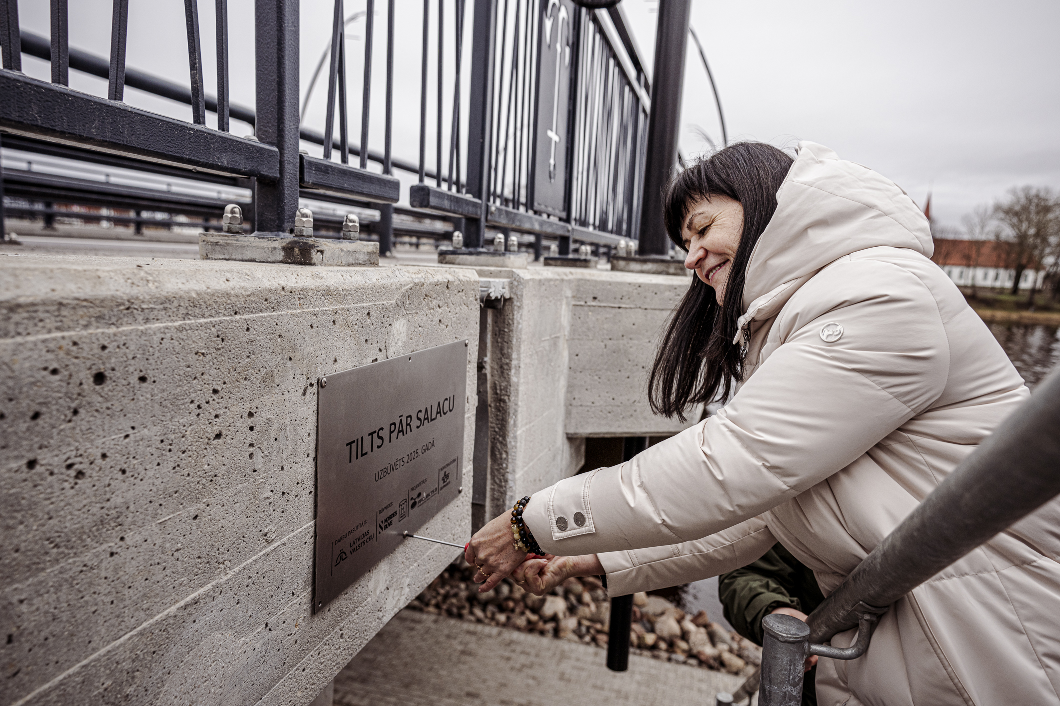 Atzīmējot būvdarbu pabeigšanu, pie tilta piestiprināta informatīva plāksne. To piestiprināja VSIA Latvijas Valsts ceļi (LVC) valdes loceklis Verners Akimovs, SIA Nordes Būve valdes loceklis Gegams Hanamirjans, SIA Tilts valdes loceklis Artjoms Gridņevs, Limbažu novada domes priekšsēdētāja Sigita Upmale, projektētājs Ģirts Šķupelis no SIA Projekts 3 un būvuzraugs Arnis Linde no AS Ceļuprojekts.
