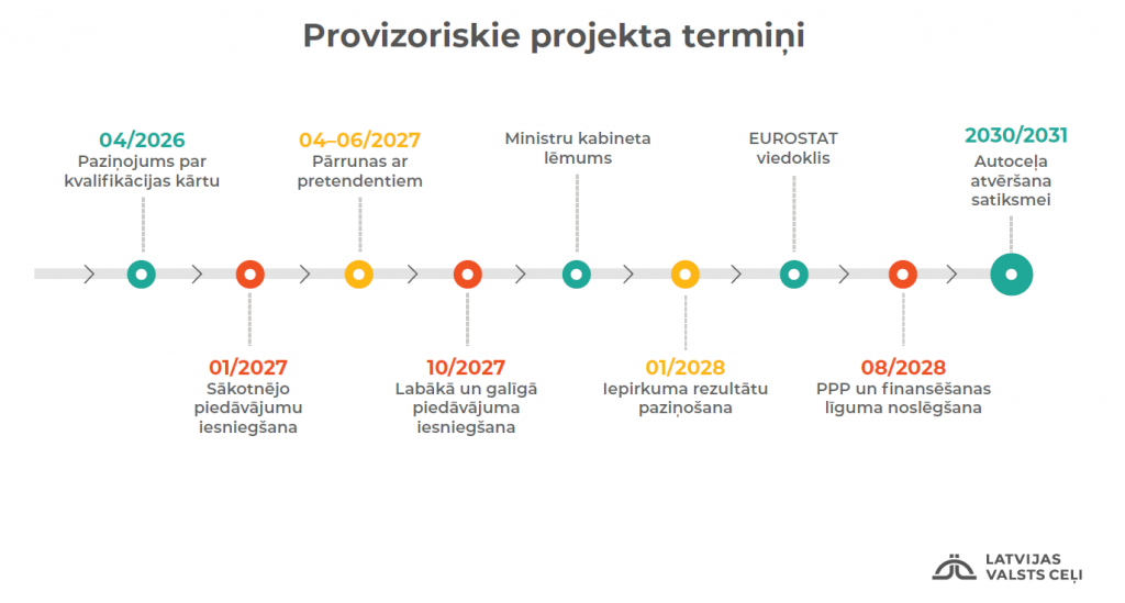 Ar MK rīkojumu Satiksmes ministrijai (SM) uzdots uzsākt PPP procedūru. Atbilstoši deleģēšanas līgumam starp SM un VSIA Latvijas Valsts ceļi (LVC) PPP procedūru veiks LVC. Bauskas apvedceļa PPP projekta plānotais laika grafiks paredz, ka uzreiz pēc MK rīkojuma izdošanas, tiek uzsākta zemju atsavināšana apvedceļa izbūvei, 2025. gada laikā tiks izstrādāta Bauskas apvedceļa PPP iepirkuma dokumentācija, PPP iepirkumu plānots izsludināt 2026. gada sākumā, bet 2028. gada pirmajā pusē noslēgt PPP līgumu. Bauskas apvedceļa projektēšanai un būvdarbiem jānotiek no 2028. līdz 2030./2031. gadam.